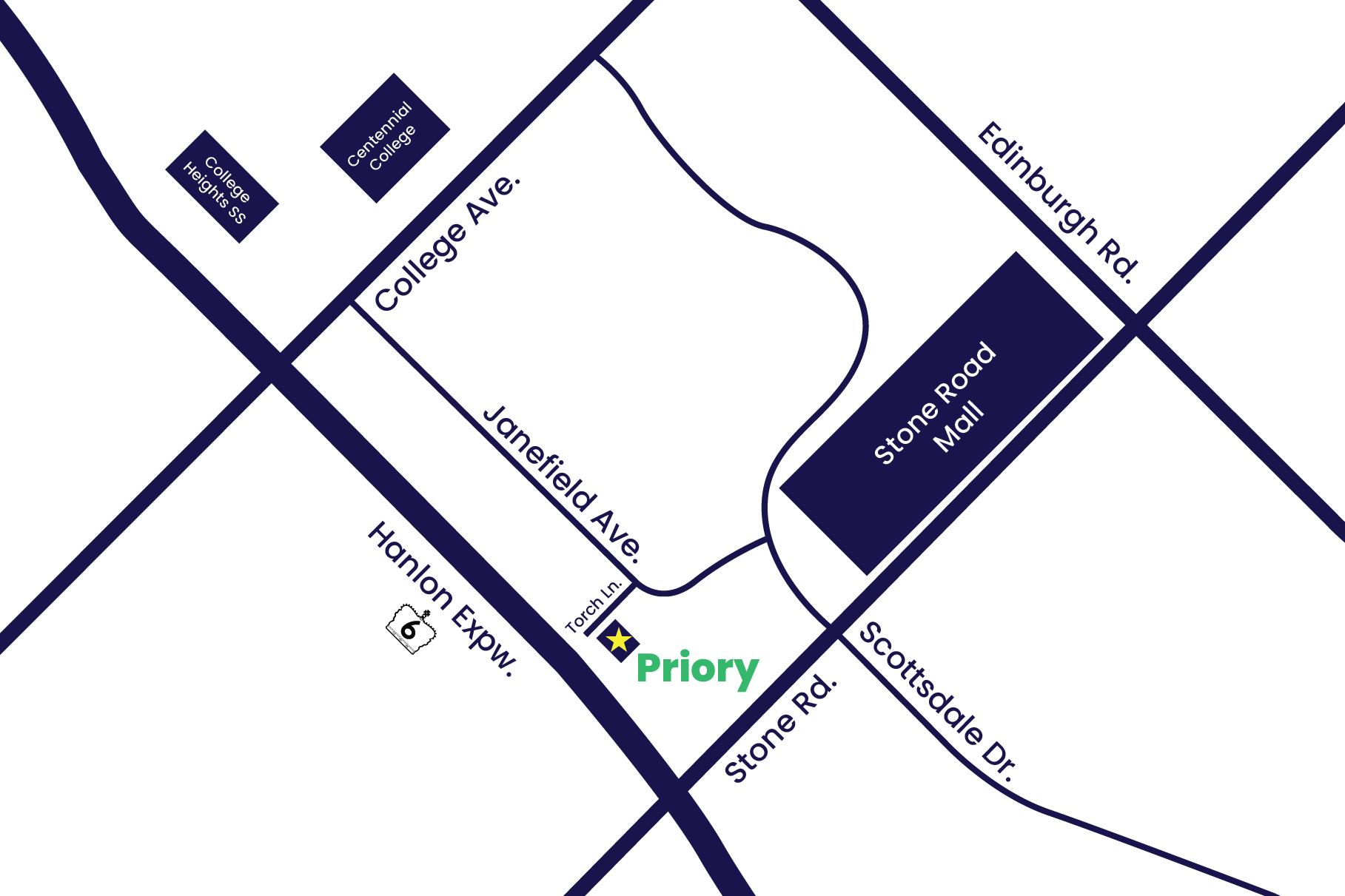 We’re on a little cul-de-sac named Torch Lane off Janefield Ave. between the Hanlon and Stone Road Mall. From the North you can access Janefiled from College Ave (near Centennial College). From the South you can access Janefield through Scottsdale just west of Stone Road Mall.